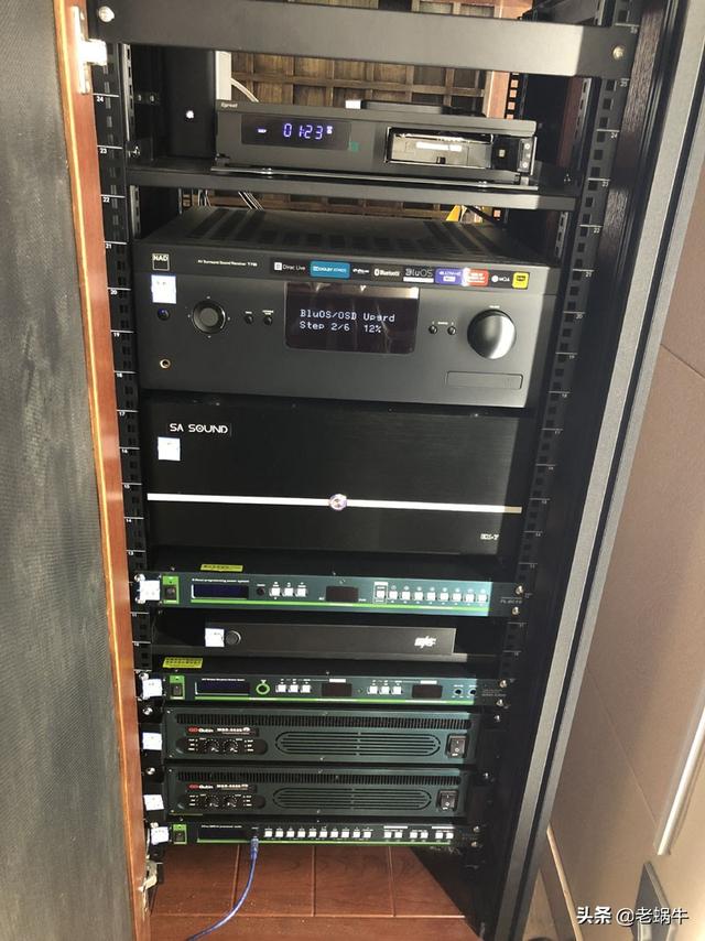 设备柜使用的是猛犸影音室专用机柜,风格颜色和整个影音室都比较搭,里面已经塞满了设备。上面是影院,下面是KTV,各自独立的两套系统。